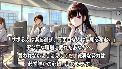 職場の人間関係の悩み職場で仕事をサボる人を見ると、心のどこかでモヤモヤしますよね。 自分ばかり忙しくして、あの人はスマホばかり。 それでも同じ給料で、上司もなぜか注意しない──。 真面目に働くほど、不公平さに疲れてしまうものです。 けれど、...